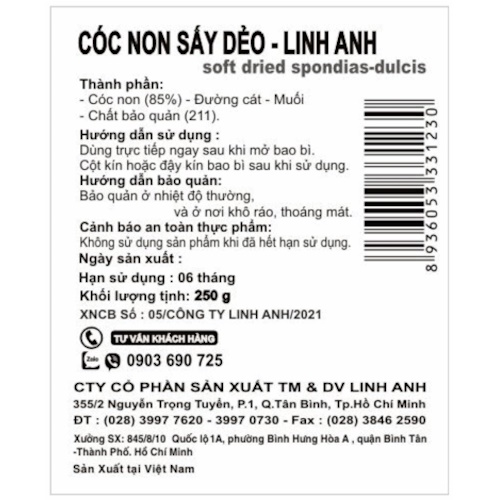 - Chất Lượng Đảm Bảo: Mứt cóc sấy dẻo gói nhôm của Linh Anh được sản xuất từ những trái cóc tươi ngon nhất, qua quy trình chế biến hiện đại để giữ được hương vị và chất dinh dưỡng.